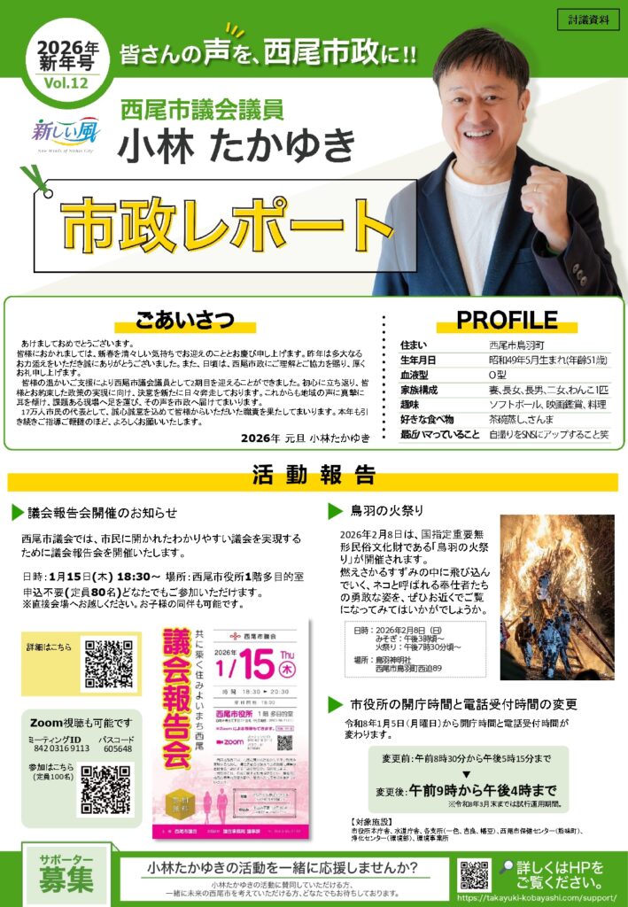 私自身は2児の父として、より住みやすい西尾市、子ども達の未来のために活動しています。小林たかゆきと共に、西尾市を盛り上げていきましょう! (サポーターFより)