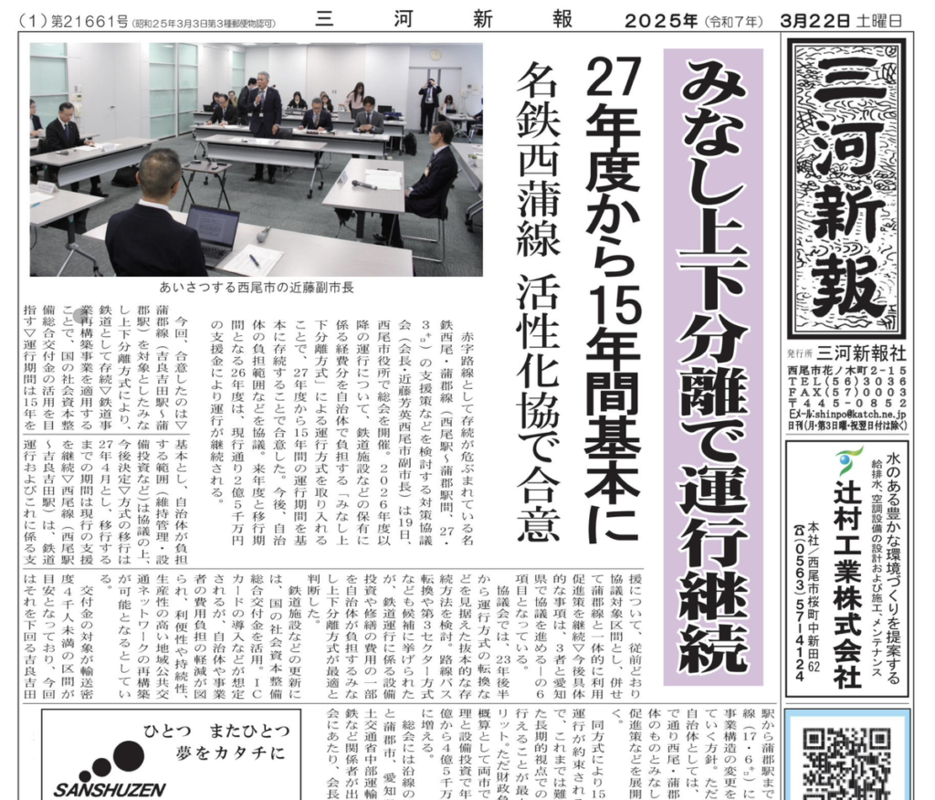 赤字路線として存統が危ぶまれていた名鉄西尾・蒲郡線の支援策などを検討する対策協議会は3月19日、西尾市役所で総会を開催。