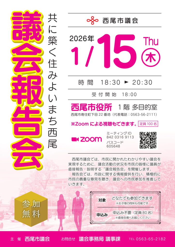 西尾市議会では、市民に開かれたわかりやすい議会を実現するために議会報告会を開催いたします。